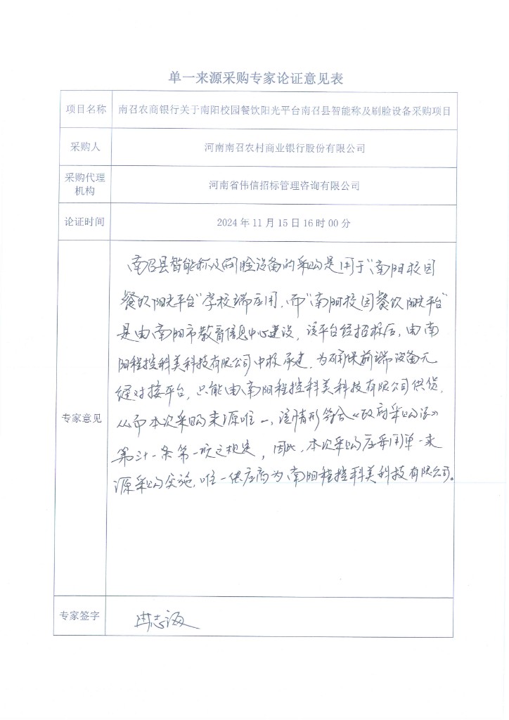 為促進(jìn)我行業(yè)務(wù)發(fā)展,根據(jù)中共南陽市紀(jì)律檢查委員會、南陽市監(jiān)察委員會、南陽市教育局聯(lián)合發(fā)布的《關(guān)于擬建設(shè)“南陽市校園餐飲陽光平臺”情況報(bào)告》要求,我行承擔(dān)南召縣校園餐飲陽光平臺建設(shè)項(xiàng)目。經(jīng)考察查證,2024年08月15日南陽市教育信息技術(shù)服務(wù)中心已對“南陽市校園餐飲陽光平臺建設(shè)開發(fā)服務(wù)項(xiàng)目”進(jìn)行了招標(biāo),中標(biāo)人為南陽程控科美科技有限公司,該公司負(fù)責(zé)該項(xiàng)目的開發(fā)建設(shè)、更新升級及后續(xù)運(yùn)維工作。在本項(xiàng)目中,智能收貨終端及人臉識別終端作為關(guān)鍵硬件組成部分且需與平臺系統(tǒng)實(shí)現(xiàn)無縫對接、互聯(lián)互通,以確保食材收貨流程的順暢與穩(wěn)定。南陽程控科美科技有限公司的智能收貨終端及人臉識別終端已經(jīng)過測試,并與“南陽市校園餐飲陽光平臺”系統(tǒng)實(shí)現(xiàn)了完美對接。這些設(shè)備在功能、性能及接口標(biāo)準(zhǔn)上均符合平臺要求,具有高度的兼容性和穩(wěn)定性。為確保項(xiàng)目實(shí)施的連續(xù)性和穩(wěn)定性,避免因設(shè)備更換帶來的技術(shù)風(fēng)險(xiǎn)和時(shí)間成本,依據(jù)“《中華人民共和國政府采購法》第三十一條(一)只能從唯一供應(yīng)商處采購的;”規(guī)定,本項(xiàng)目擬采用單一來源采購方式進(jìn)行采購。
