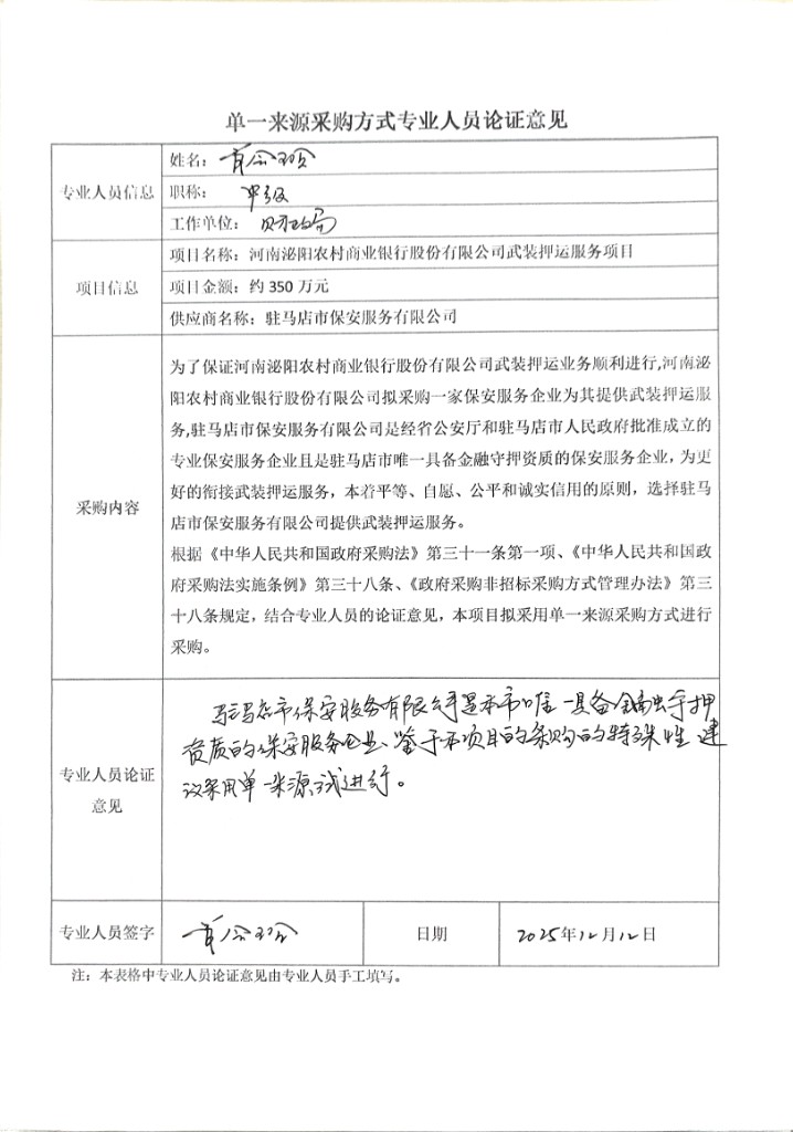 為了保證河南泌陽農(nóng)村商業(yè)銀行股份有限公司武裝押運業(yè)務(wù)順利進行,河南泌陽農(nóng)村商業(yè)銀行股份有限公司擬采購一家保安服務(wù)企業(yè)為其提供武裝押運服務(wù),駐馬店市保安服務(wù)有限公司是經(jīng)省公安廳和駐馬店市人民政府批準成立的專業(yè)保安服務(wù)企業(yè)且是駐馬店市唯一具備金融守押資質(zhì)的保安服務(wù)企業(yè),為更好的銜接武裝押運服務(wù),本著平等、自愿、公平和誠實信用的原則,選擇駐馬店市保安服務(wù)有限公司提供武裝押運服務(wù)。