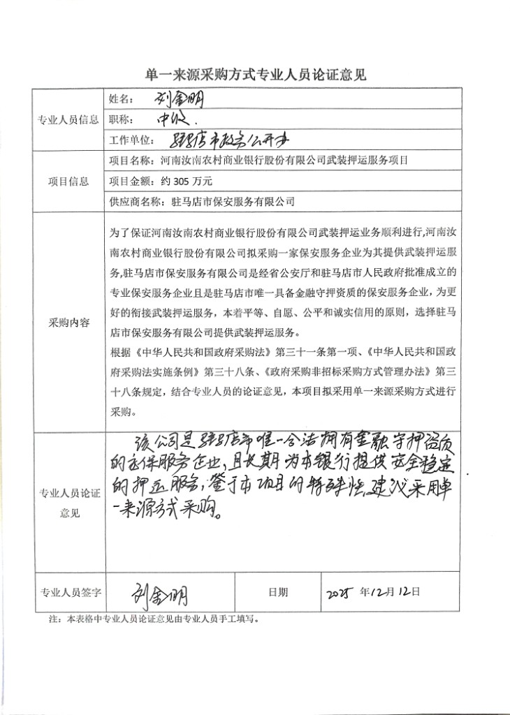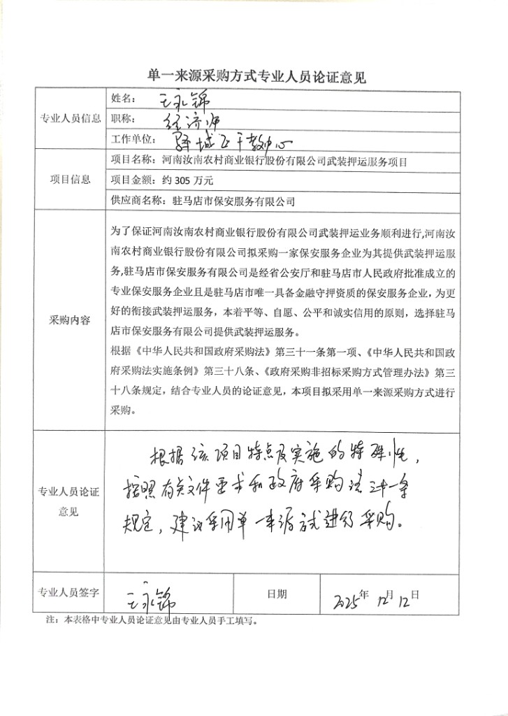 為了保證河南汝南農(nóng)村商業(yè)銀行股份有限公司武裝押運(yùn)業(yè)務(wù)順利進(jìn)行,河南汝南農(nóng)村商業(yè)銀行股份有限公司擬采購(gòu)一家保安服務(wù)企業(yè)為其提供武裝押運(yùn)服務(wù),駐馬店市保安服務(wù)有限公司是經(jīng)省公安廳和駐馬店市人民政府批準(zhǔn)成立的專業(yè)保安服務(wù)企業(yè)且是駐馬店市唯一具備金融守押資質(zhì)的保安服務(wù)企業(yè),為更好的銜接武裝押運(yùn)服務(wù),本著平等、自愿、公平和誠(chéng)實(shí)信用的原則,選擇駐馬店市保安服務(wù)有限公司提供武裝押運(yùn)服務(wù)。