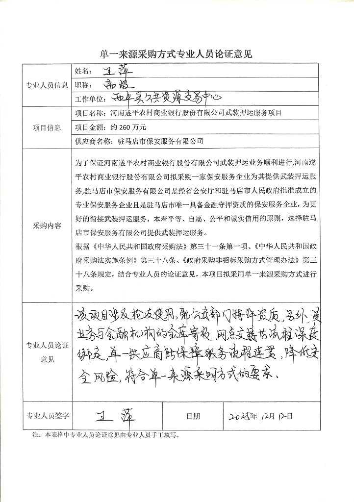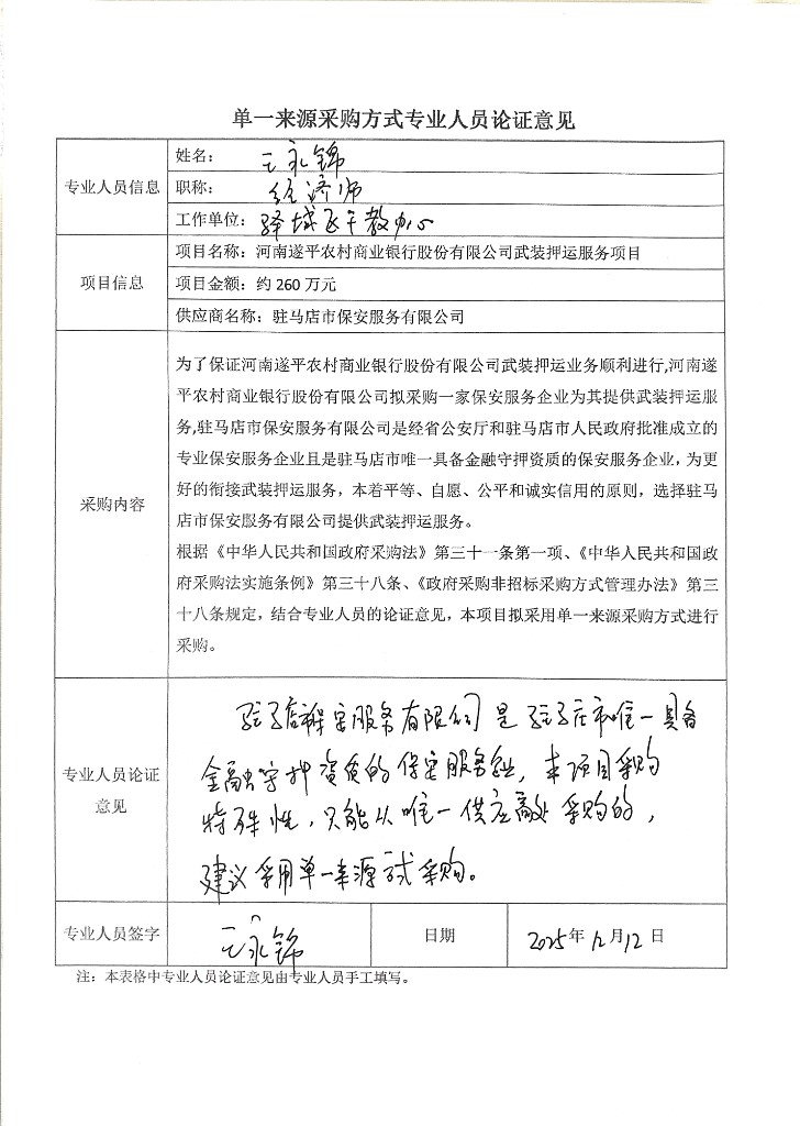 為了保證河南遂平農(nóng)村商業(yè)銀行股份有限公司武裝押運(yùn)業(yè)務(wù)順利進(jìn)行,河南遂平農(nóng)村商業(yè)銀行股份有限公司擬采購一家保安服務(wù)企業(yè)為其提供武裝押運(yùn)服務(wù),駐馬店市保安服務(wù)有限公司是經(jīng)省公安廳和駐馬店市人民政府批準(zhǔn)成立的專業(yè)保安服務(wù)企業(yè)且是駐馬店市唯一具備金融守押資質(zhì)的保安服務(wù)企業(yè),為更好的銜接武裝押運(yùn)服務(wù),本著平等、自愿、公平和誠實(shí)信用的原則,選擇駐馬店市保安服務(wù)有限公司提供武裝押運(yùn)服務(wù)。
