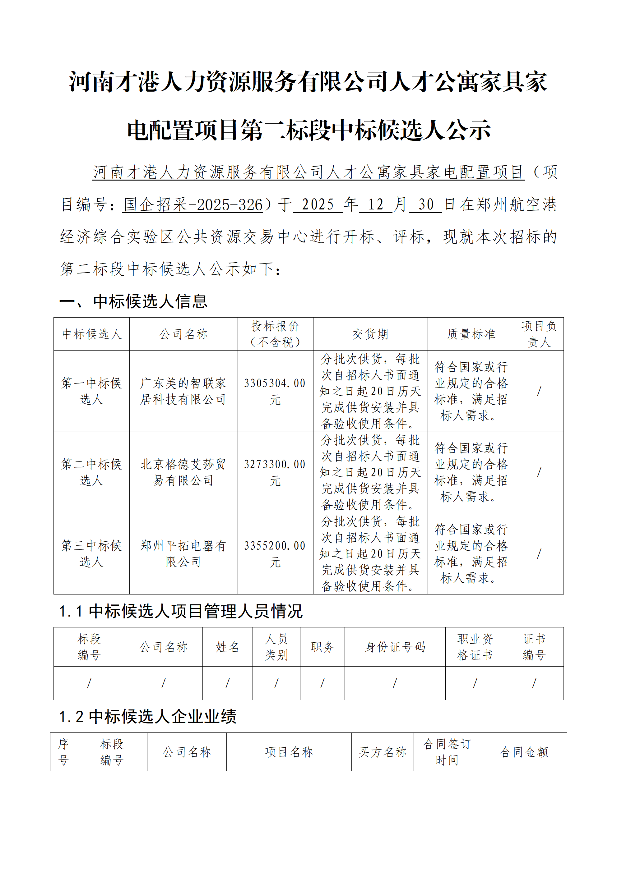 河南才港人力資源服務(wù)有限公司人才公寓家具家電配置項目第二標段中標候選人公示
