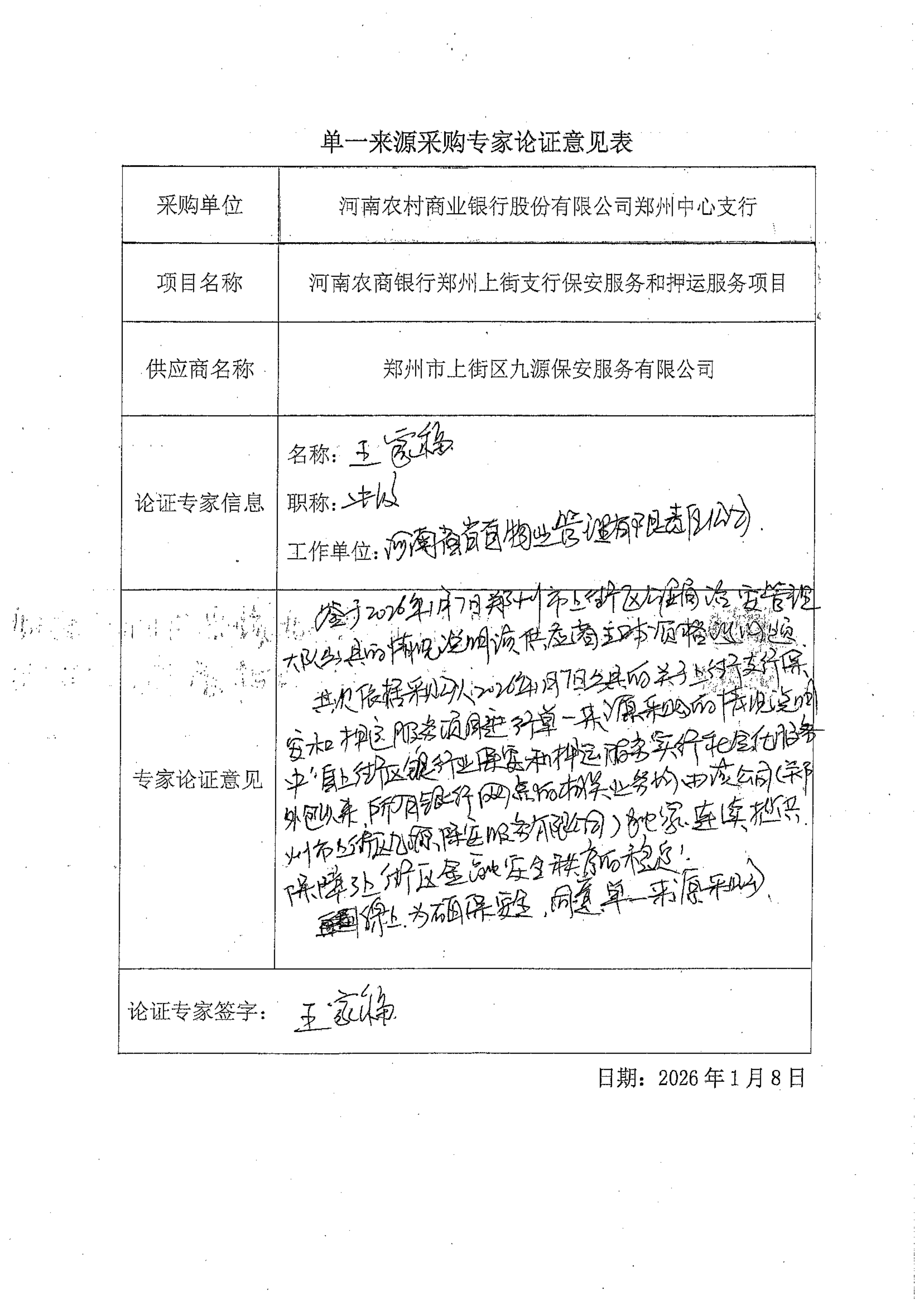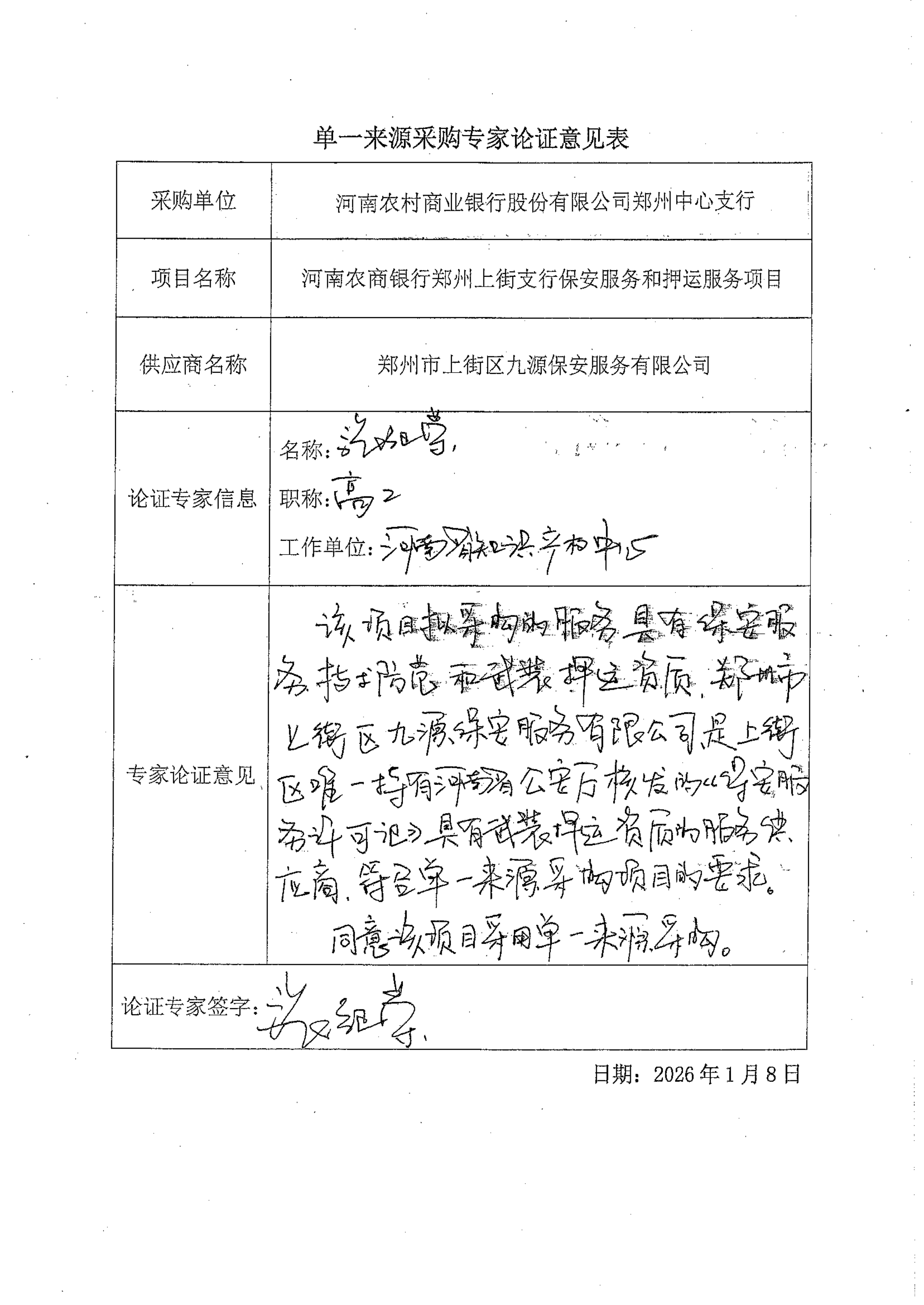 自上街區(qū)銀行業(yè)保安和押運服務實行社會化服務外包以來,所有銀行網點的相關業(yè)務均由該公司獨家、連續(xù)提供,保障了上街區(qū)金融安全秩序的穩(wěn)定。因此,基于其獨特的市場地位及長期的服務歷史,擬推薦鄭州市上街區(qū)九源保安服務有限公司為河南農商銀行鄭州上街支行保安服務和押運服務項目的唯一供應商。經專家論證根據該項目采購需求,向鄭州市上街區(qū)九源保安服務有限公司進行單一來源采購。