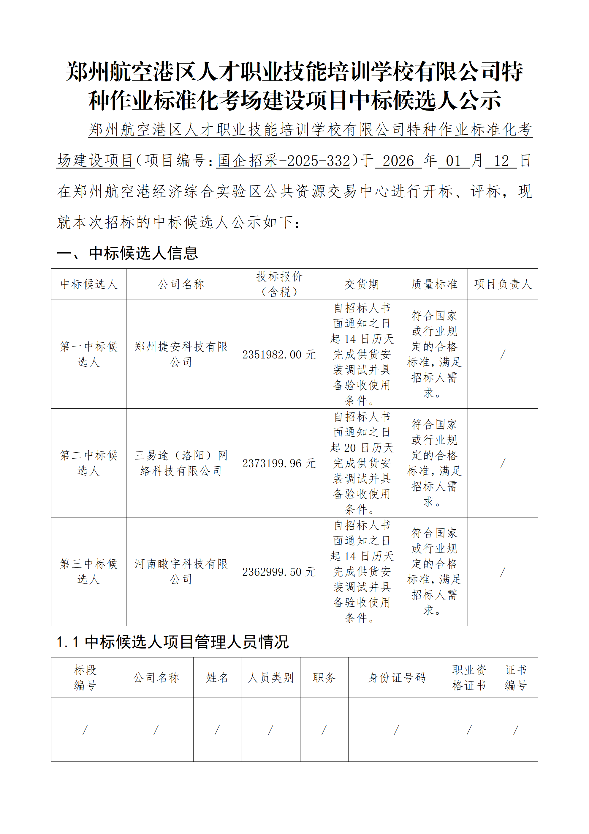 鄭州航空港區(qū)人才職業(yè)技能培訓(xùn)學(xué)校有限公司特種作業(yè)標(biāo)準(zhǔn)化考場(chǎng)建設(shè)項(xiàng)目中標(biāo)候選人公示